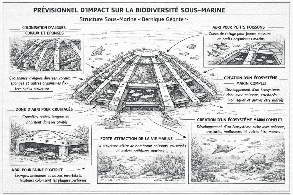 Inspirées des structures naturelles des littoraux rocheux, ces installations recréent des écosystèmes fonctionnels et résilients.